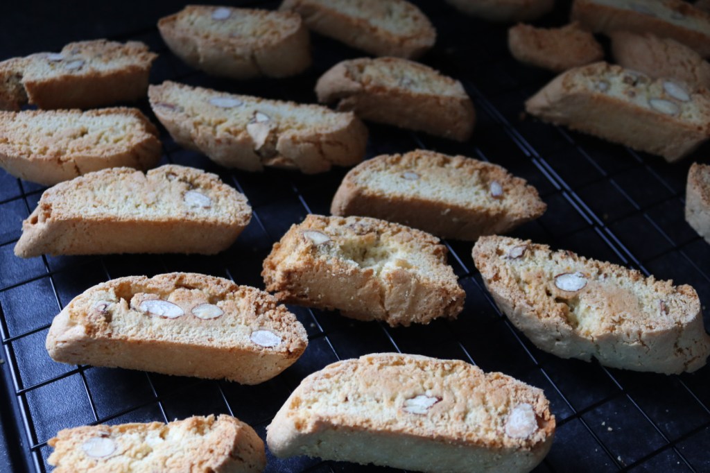 For the cantuccini, you mix together the ingredients to form a dough which you then separate and roll out into three sausage shapes. These then bake in the oven and fill your home with the most gorgeous citrusy smells. You then take them out and, once cool enough to handle, you slice them diagonally into the individual biscuits. This is where I made a few errors as the biscuits crumbled and cracked as I tried to slice (I don’t know if this means they were also under-baked, maybe I’m just a serial under-baker), anyway, I picked up the pace and tried to slice them so fast they didn’t know what was happening and therefore didn’t have time to crumble. They then return to the oven and finish baking and harden up. They were monsters in size and had the potential to crack a tooth but, my goodness, there were lovely.