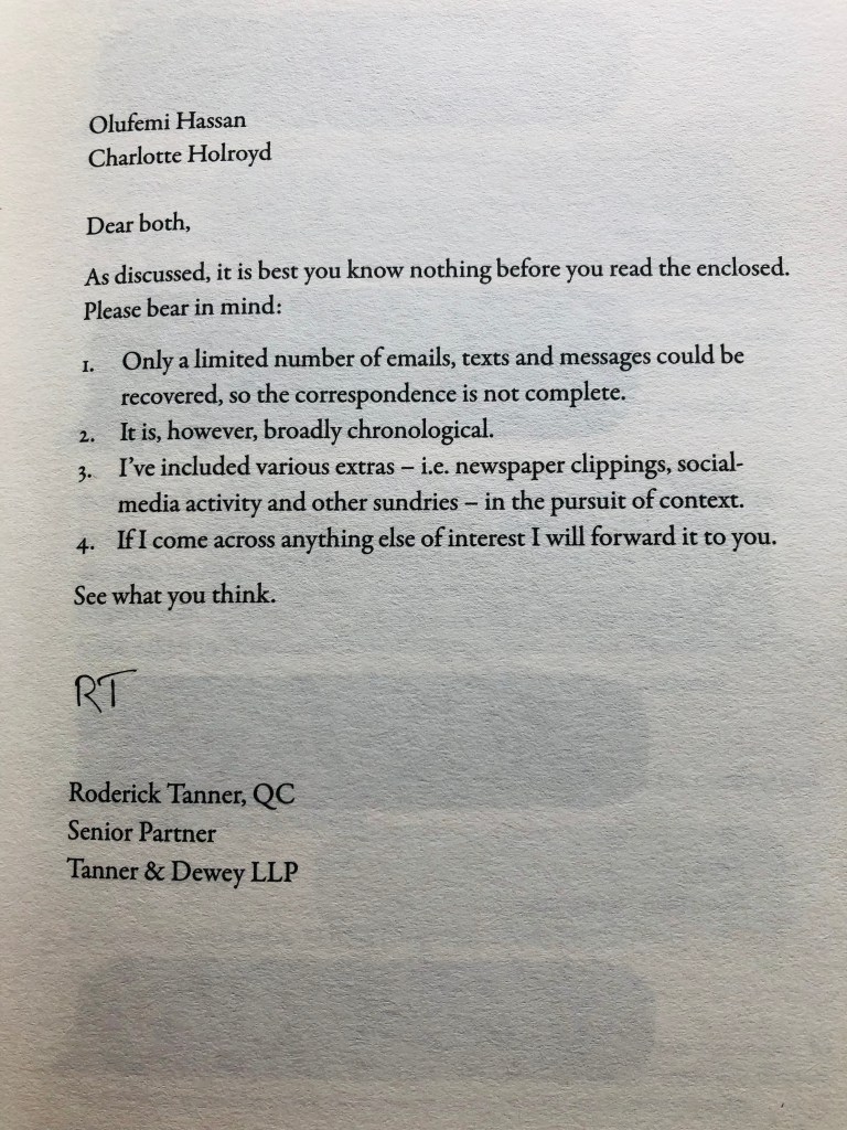 Charlotte and Femi are given case papers to read and prepare. It’s a collection of emails, text messages and other written notes, and we read through them as they do. The messages have been put in chronological order: they start with the arrival of two new members to a community, a little girl being diagnosed with a serious illness and a family desperate to raise money for a new drug that might save her, and, on top of all of that, there is a play that needs to be cast and rehearsed.